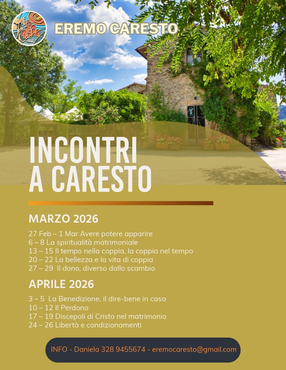 Tornano gli "Incontri a Caresto" per la Primavera 2026 SANT'ANGELO IN VADO (PU) L’Eremo di Caresto riapre le sue porte per la stagione primaverile 2026, proponendo un fitto calendario di weekend dedicati alla crescita spirituale e al benessere della coppia. Immersi nella cornice suggestiva delle colline marchigiane, gli incontri offrono uno spazio di ascolto e dialogo lontano dalla frenesia quotidiana. Il programma di marzo e aprile si articola in una serie di ritiri tematici, pensati per affrontare le sfide e le bellezze della vita matrimoniale e relazionale attraverso la lente della spiritualità e della condivisione. Tutti gli incontri si svolgono durante il fine settimana. Per maggiori dettagli sul programma, le modalità di partecipazione e l'ospitalità, è possibile contattare la segreteria: Referente: Daniela Telefono: 328 9455674 E-mail: eremocaresto@gmail.com