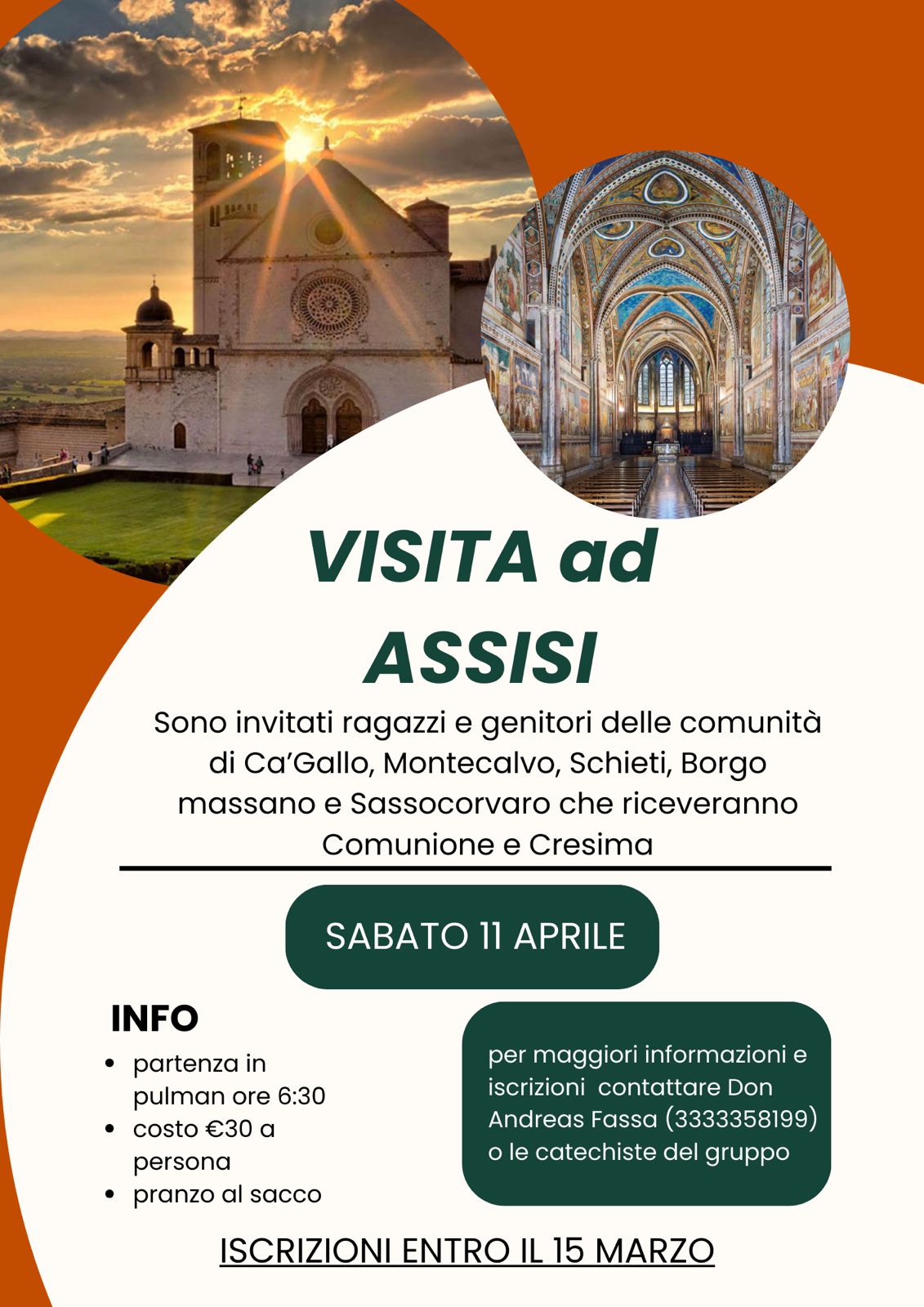 VISITA AD ASSISI Un viaggio nel cuore della spiritualità francescana per prepararsi ai sacramenti. Le comunità parrocchiali di Ca’Gallo, Montecalvo, Schieti, Borgo Massano e Sassocorvaro organizzano una visita guidata ad Assisi, prevista per la giornata di sabato 11 aprile. L’iniziativa è rivolta in particolare ai ragazzi che si apprestano a ricevere la Prima Comunione e la Cresima, insieme ai loro genitori. L'obiettivo è offrire un'esperienza di fede vissuta e condivisa, lontano dalla routine quotidiana, per scoprire i luoghi che hanno segnato la vita del Poverello di Assisi.