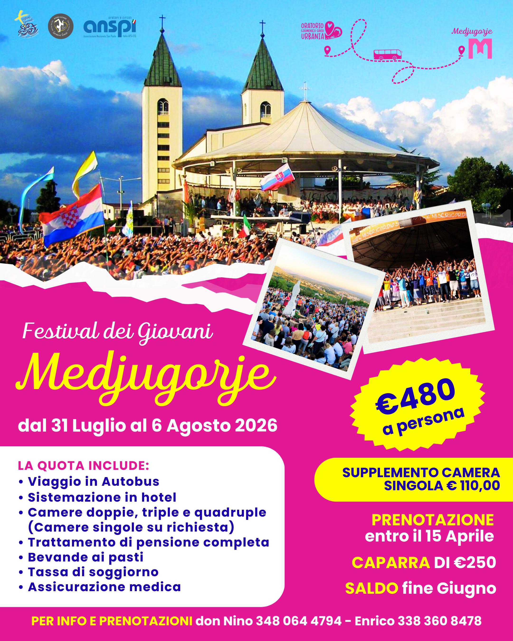 FESTIVAL DI MEDJUGORJE 2026 Un viaggio che va oltre il semplice pellegrinaggio, un'esperienza di vita che unisce migliaia di ragazzi da tutto il mondo. L'Oratorio "Domenico Savio" di Urbania, in collaborazione con ANSPI, annuncia l'apertura delle iscrizioni per la partecipazione al celebre "Festival dei Giovani" (Mladifest) a Medjugorje, che si terrà dal 31 luglio al 6 agosto 2026. Dati sintetici dell'evento: Date: 31 Luglio – 6 Agosto 2026 Quota di partecipazione: € 480,00 a persona (in camere doppie, triple o quadruple) Servizi inclusi: Viaggio in autobus, hotel, bevande ai pasti, tassa di soggiorno e assicurazione medica. Supplemento singola: € 110,00 Modalità di Iscrizione Per garantire l'organizzazione logistica, la prenotazione è obbligatoria entro il 15 aprile 2026, previo versamento di una caparra di € 250,00. Il saldo finale dovrà essere effettuato entro la fine di giugno. Per informazioni dettagliate e per procedere alle iscrizioni, i responsabili del viaggio sono a disposizione: Don Nino: 348 064 4794 Enrico: 338 360 8478