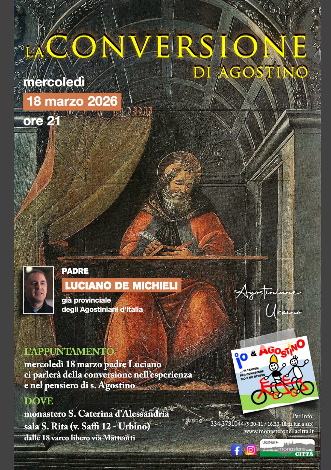 MERCOLEDI' 18 MARZO ore 21,00 La conversione di Sant'Agostino L'evento vedrà come ospite d’eccezione Padre Luciano De Michieli, già provinciale degli Agostiniani d’Italia. Grazie alla sua vasta esperienza, Padre Luciano guiderà i presenti alla scoperta del tema della conversione, analizzandolo attraverso il pensiero e l’esperienza biografica di Sant’Agostino, figura cardine della spiritualità e della filosofia occidentale. L’incontro si inserisce nel contesto delle iniziative promosse dalle Agostiniane di Urbino e dal progetto “Monastero nella Città”, volto a rendere il chiostro un luogo vivo di dialogo e conoscenza, sotto il motto dell'iniziativa Io & Agostino: "...in tandem per conoscere Dio e me stesso".