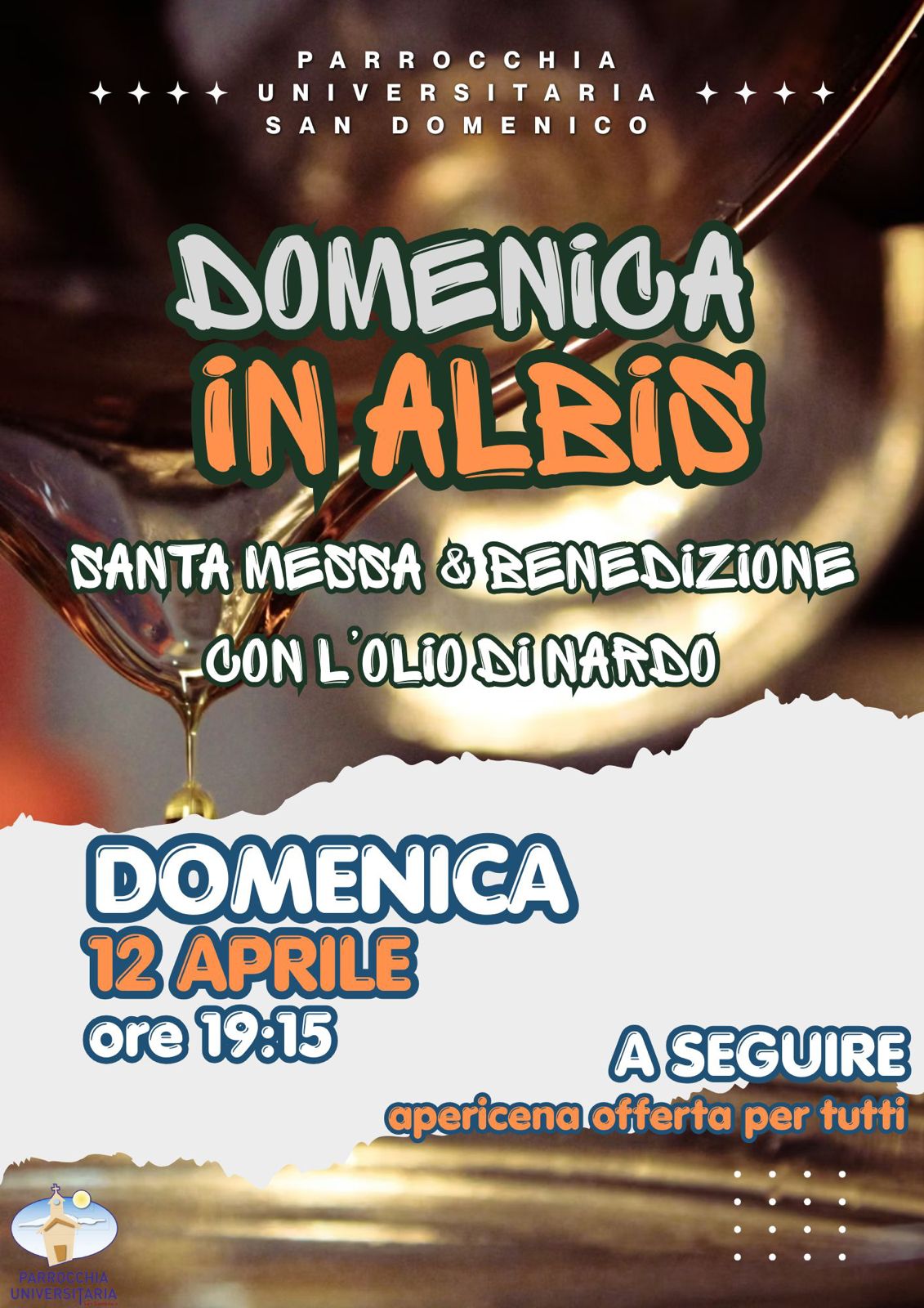Domenica 12 Aprile ore 19.15 Parrocchia universitaria San Domenico. La celebrazione si aprirà con la Santa Messa, un momento di preghiera centrale nel tempo pasquale. La liturgia sarà arricchita da un rito particolarmente suggestivo: la Benedizione con l’Olio di Nardo. Al termine della funzione religiosa, la serata proseguirà all'insegna della fraternità. La Parrocchia è lieta di invitare tutti i presenti a un’apericena offerta