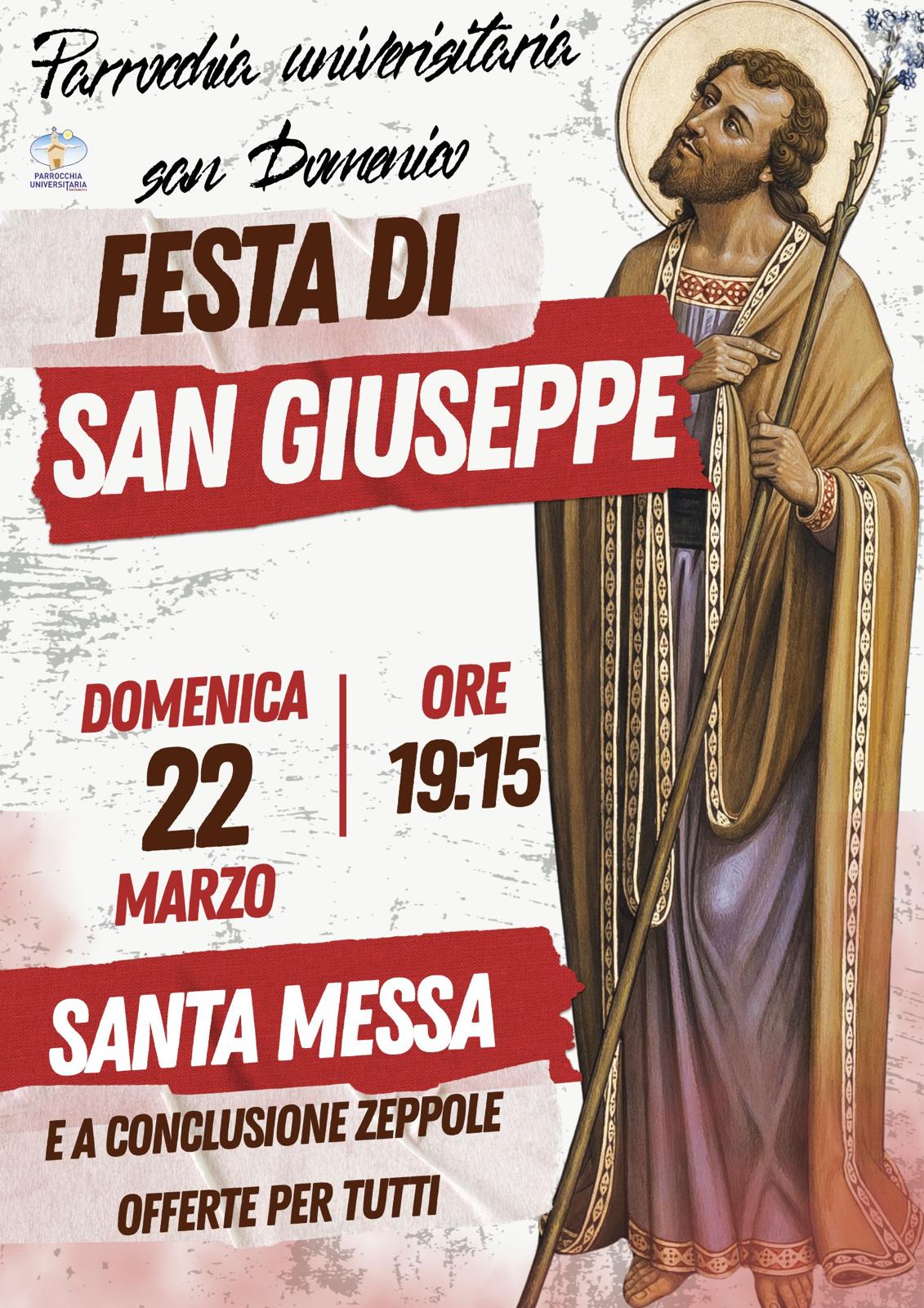 La Parrocchia Universitaria San Domenico celebrerà la Santa Messa in onore di San Giuseppe. Al termine seguirà un momento conviviale aperto a tutti gli studenti e alla cittadinanza.